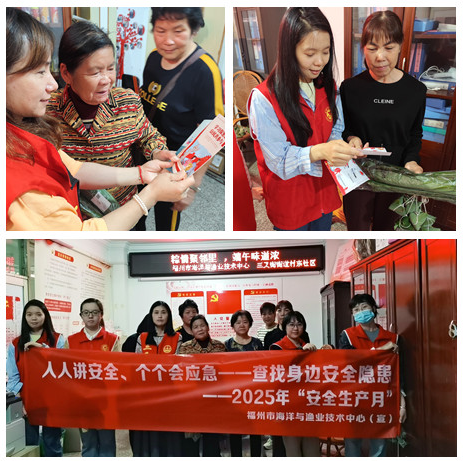 为深入贯彻落实习近平总书记关于安全生产的重要论述和重要指示批示精神,增强社区居民的安全防范意识,同时进一步推动中华优秀传统文化的传承与发展,5月29日,市海洋与渔业技术中心联合村东社区开展了“粽情聚邻里,端午味道浓”端午节共建暨2025年“人人讲安全、个个会应急——查找身边安全隐患”安全生产月主题宣传活动。