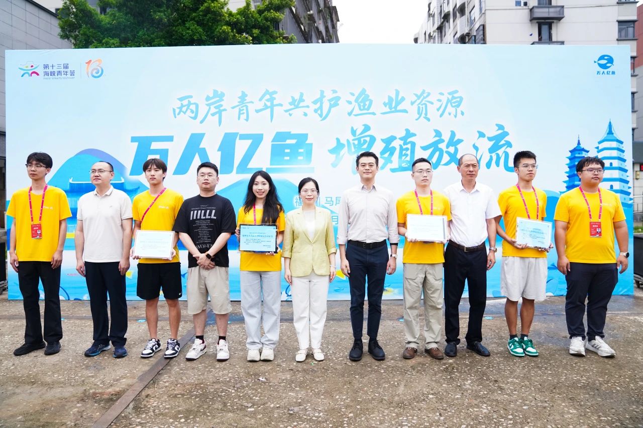 在众人的见证下,参与活动的嘉宾领导们为积极参与“两岸青年共护渔业资源”增殖放流活动的青年代表们颁发了增殖放流公益证书。