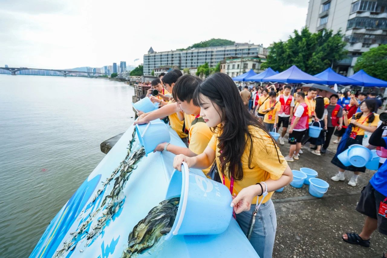 随后,在热烈的氛围中,百名青年代表分批有序地进行放流,将一尾尾鱼苗放流闽江。