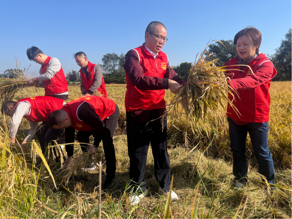 活动现场,党员志愿者们身着红色马甲,在当地农户指导下,走进金黄稻田参与水稻收割。众人分工协作,有的弯腰挥镰,熟练割下沉甸甸的稻穗;有的默契配合,将稻穗整齐捆扎成束;还有的操作脱粒机,让金黄的稻谷簌簌落下。活动现场一片忙碌而热烈的景象,志愿者们在亲身实践中真切体验农作之辛,也在颗粒归仓的喜悦里感受农耕之乐,让活动意义愈发鲜活。