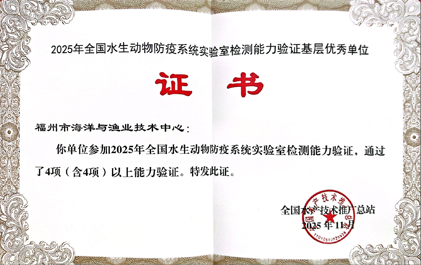 根据全国水产技术推广总站《关于公布2025年水生动物防疫系统实验室检测能力验证结果的通知》(农渔技函〔2025〕77号),技术中心参加的鲍疱疹病毒病、对虾白斑综合征等10个项目测试结果均获满意,满意项目数量在全省地市级实验室排名第一,获评2025年全国水生动物防疫系统实验室检测能力验证基层优秀单位,并获得 2026 年国家及省级水生动物疫病监测计划检测实验室资格。