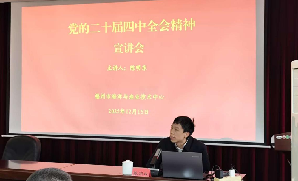 12月15日,福州市海洋与渔业局党组成员、副局长、三级调研员陈明东赴市海洋与渔业技术中心,宣讲党的二十届四中全会精神。中心全体干部职工参加会议。