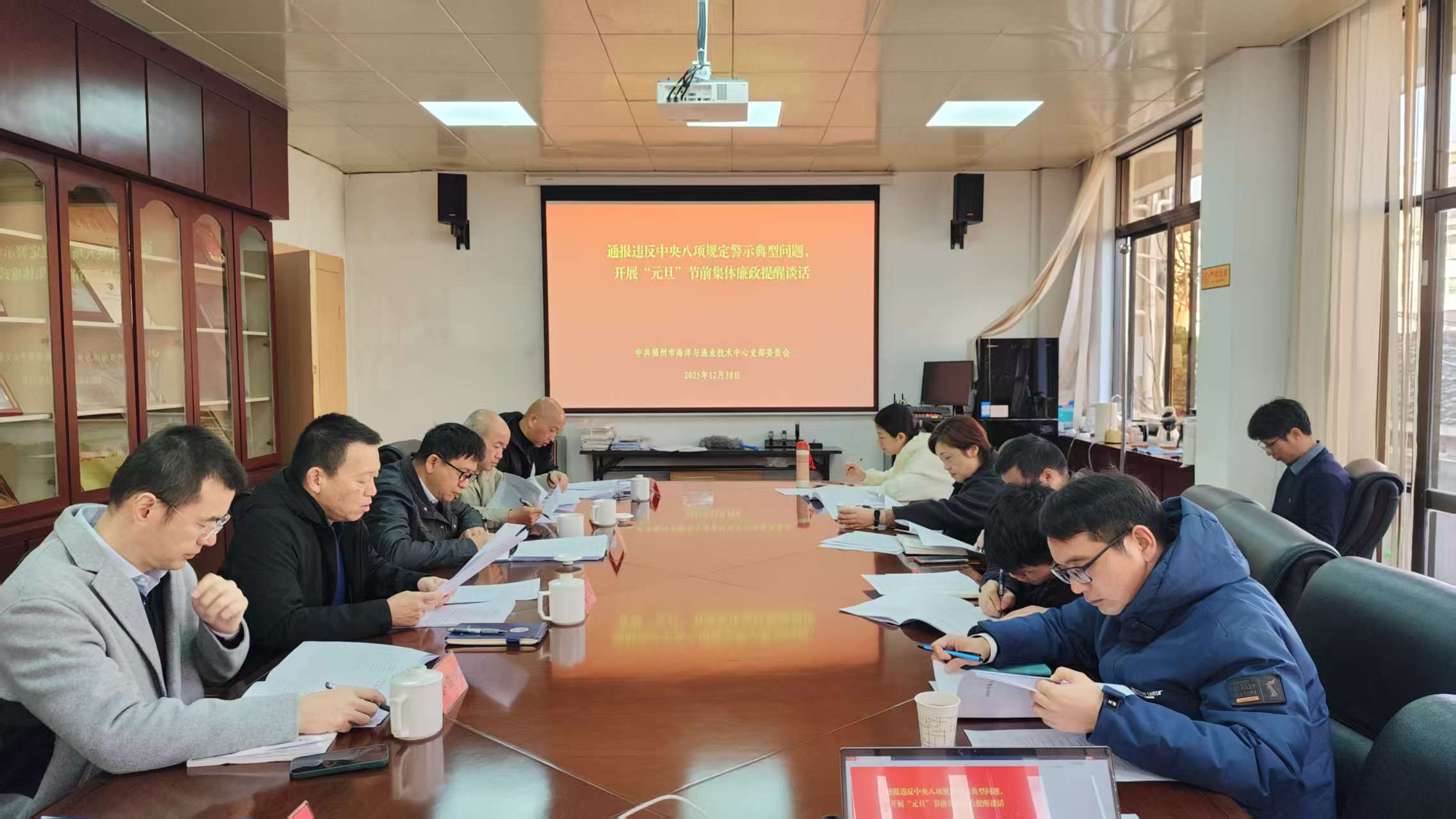 为深入贯彻落实中央八项规定及其实施细则精神,持续深化作风建设,坚决防止“四风”问题反弹回潮,确保廉洁过节,12月30日,福州市海洋与渔业技术中心开展2026年元旦、春节前集体廉政谈话。技术中心党支部书记郑世忠主持会议。技术中心领导班子、各部室负责人参加会议。