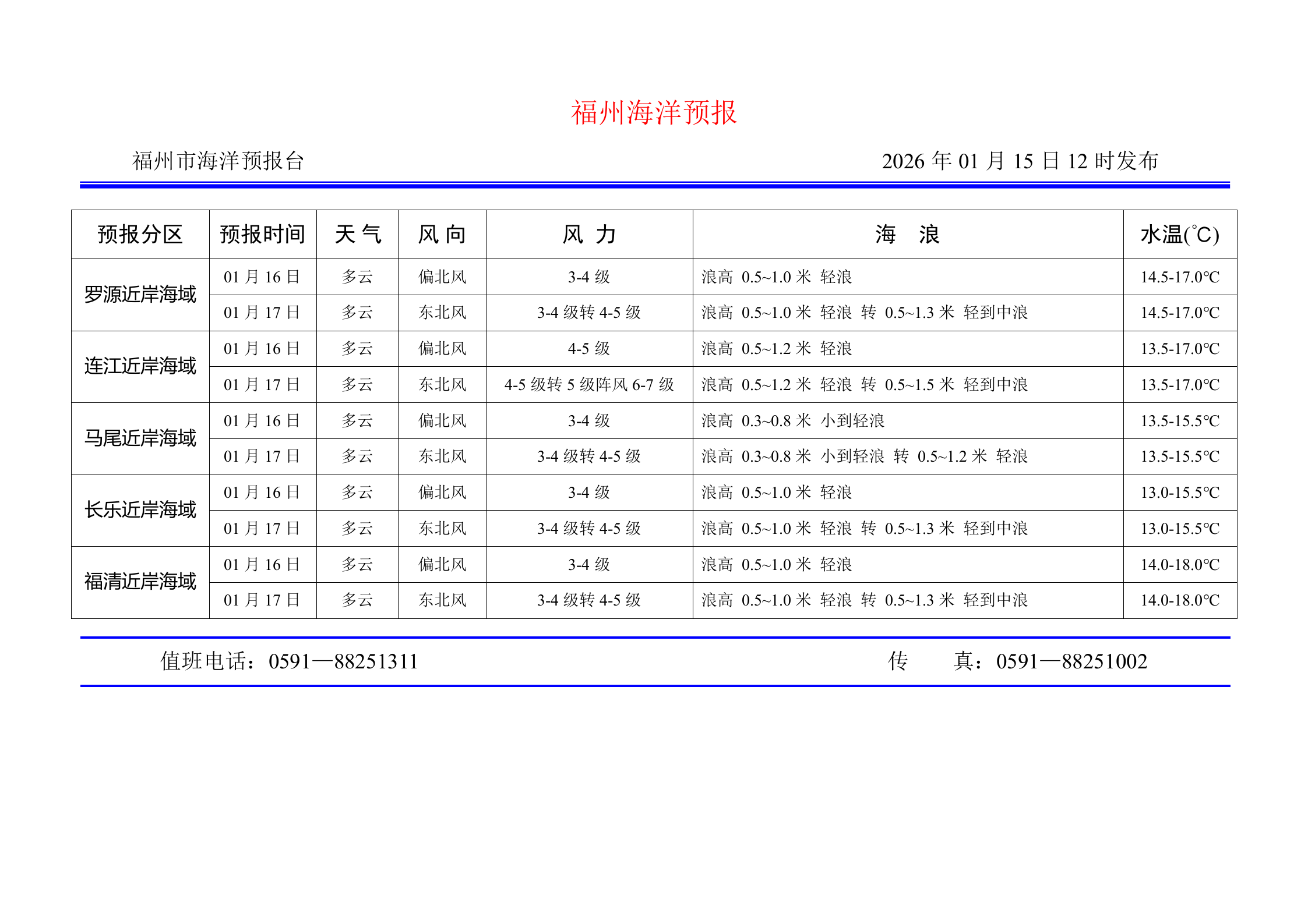 2026年1月15日福州海洋预报