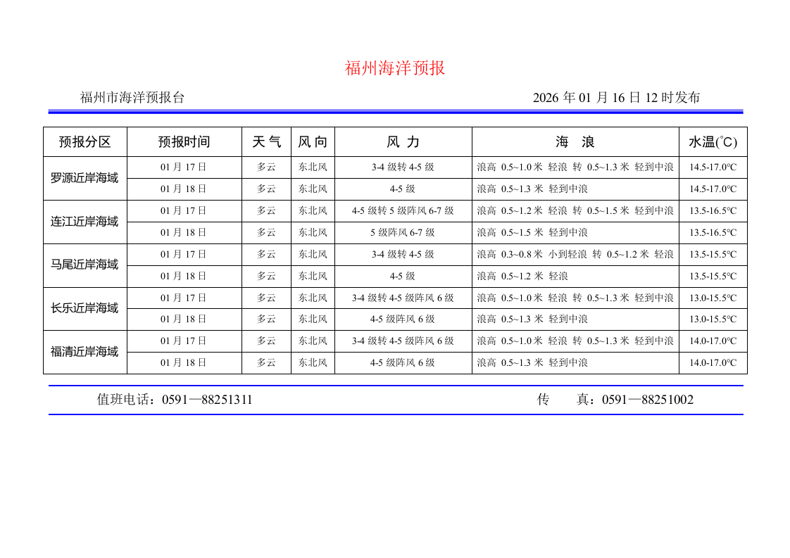 2026年1月16日福州海洋预报