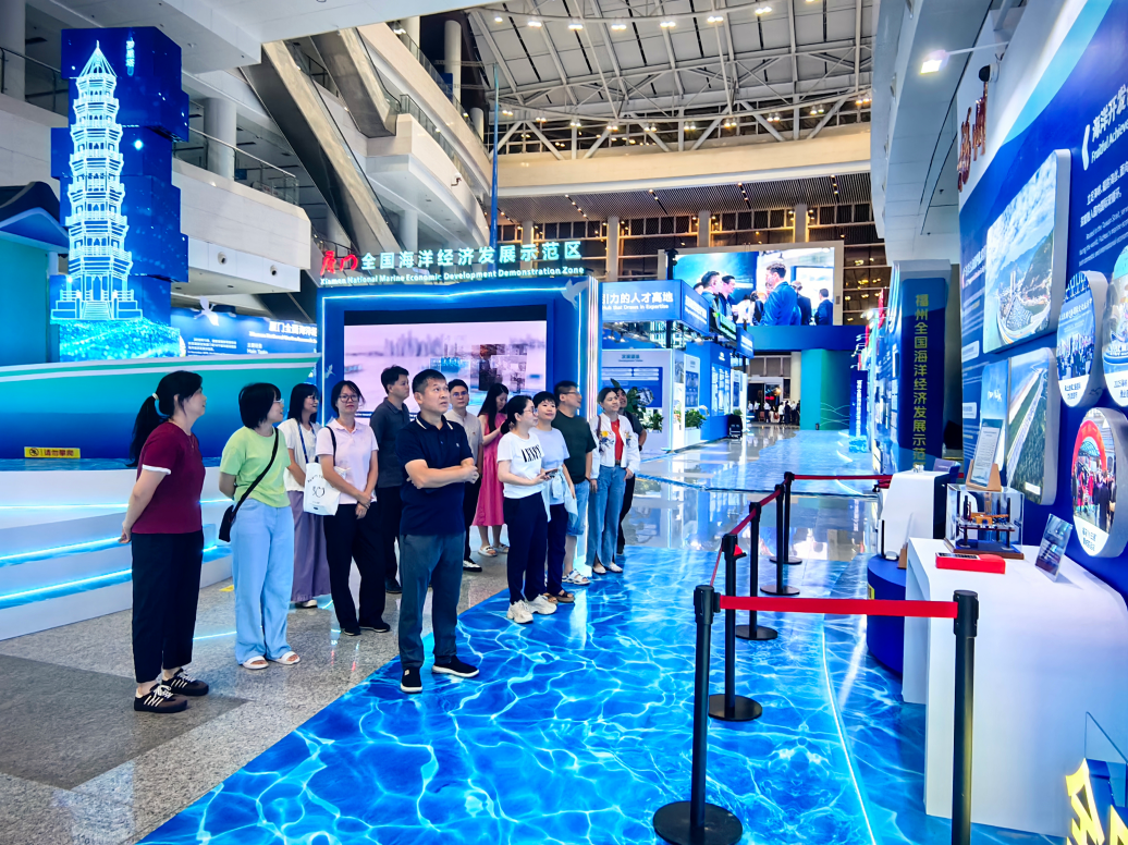 党员干部走进展馆中庭的“福建省加快建设全国海洋经济发展示范区回顾与展望”(福州展区),认真参观“向海图强”“拓海而荣”“因海而兴”“伴海而生”四大主题展区,驻足观看全球最大的8.5万吨级新型多用途船、全国最大的南极磷虾捕捞加工船“福远渔9199”精美船模,深入了解北斗海洋藻类监测系统、海洋渔业碳汇交易等福州海洋经济建设成效,深切感受福州全力推进全国海洋经济发展示范区建设的成果。