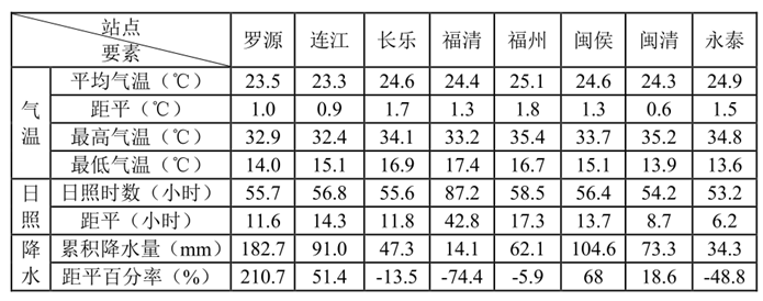 【气温】(采用国家气象观测站数据,下同):5月中旬平均气温23.3(连江)~25.1℃(福州),平均气温距平为 0.9(连江)~1.8℃(福州),平均气温较常年同期偏高;旬最高气温 35.4℃(闽清);旬最低气温 13.6℃(永泰)。