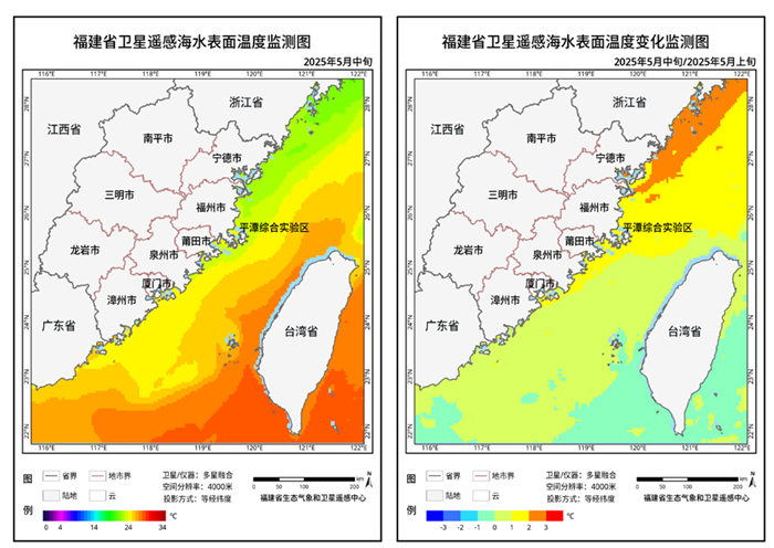 图 1 2025 年 5 月中旬福建省卫星遥感海温监测图(左)和福建省卫星遥感海温变化监测图(2025 年 5 月中旬-2025 年 5 月上旬,右)