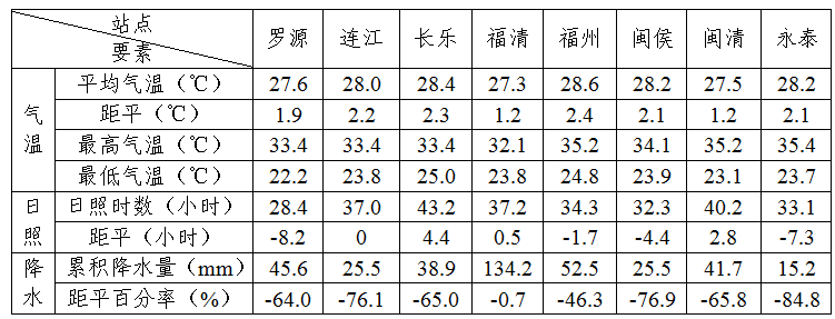 【气温】(采用国家气象观测站数据,下同):6月中旬平均气温27.3(福清)~28.6℃(福州),平均气温距平为1.2(福清、闽清)~2.4℃(福州),平均气温较常年同期显著偏高;旬最高气温35.4℃(永泰);旬最低气温22.2℃(罗源)。